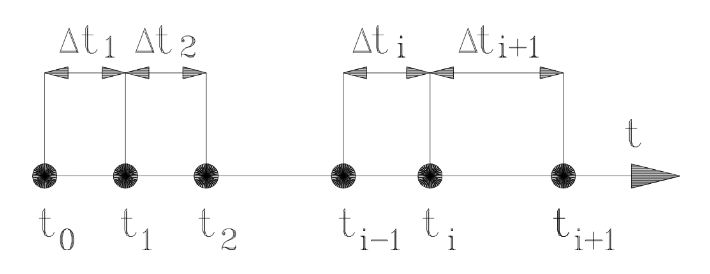 Интегрирование осуществляется последовательно; выбор величины очередного шага \(\Delta t_i\) зависит как от требуемой точности, так и от результатов интегрирования на предшествующих шагах.