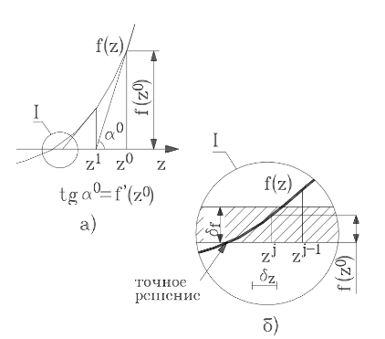 \[\begin{split}\begin{cases} z^{j} = z^{j-1} + \Delta z^{j} \\[6pt] \Delta z^{j} = -\dfrac{f(z^{j-1})}{f'(z^{j-1})} \end{cases} \qquad (1.14)\end{split}\]где \(f(z^{j-1})\) — значение функции \(f(z)\) при \(z = z^{j-1}\), \(f'(z^{j-1})\) — значение производной \(df/dz\) при \(z = z^{j-1}\).