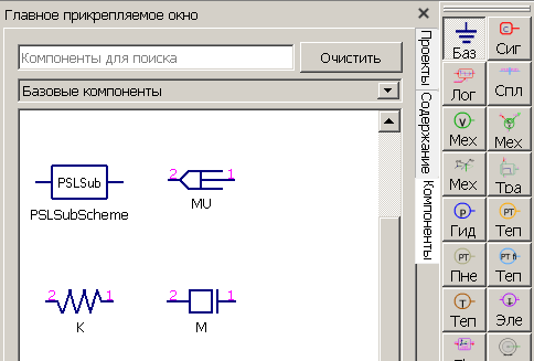 «Строка поиска» предназначена для быстрого поиска и выбора компонентов, используемых при создании схем.