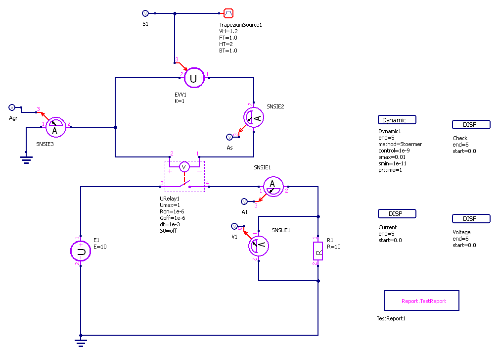 Трапециевидный сигнал от TrapeziumSource1 поступает на датчик S1 и управляет источником напряжения EVV1.
