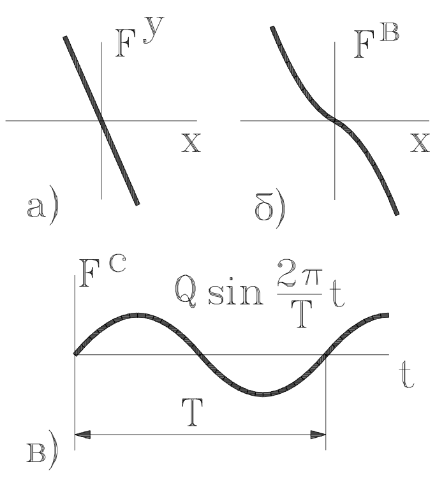 Для иллюстрации решения нелинейной задачи принято, что сила вязкого сопротивления пропорциональна квадрату относительной скорости концов демпфера (рис. 1.2б). Упругая сила пружины линейно зависит от смещения (рис. 1.2а), а внешнее воздействие имеет синусоидальный характер (рис. 1.2в).