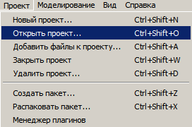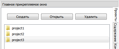 Создает новый проект. Аналогичные действия с проектами также предусмотрены в «Главном прикрепляемом окне» во вкладках «Проекты» и «Содержание». Отличие заключается в том, что при открытии для выбора проекта запускается стандартное диалоговое окно. |