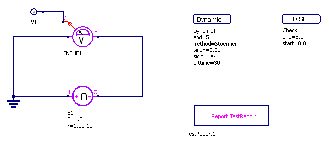 Неидеальный источник постоянного напряжения с ЭДС E = 1 В и внутренним сопротивлением r = 1e-10 Ом