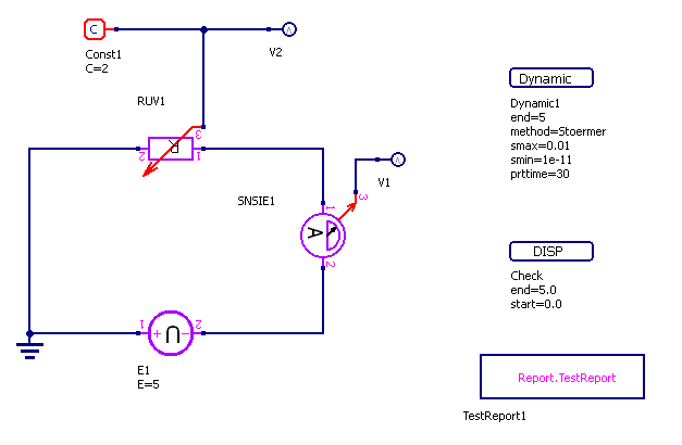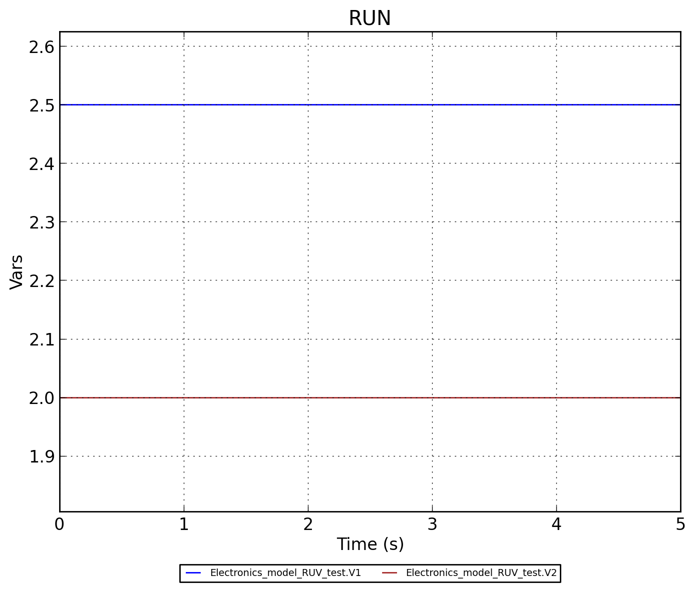 В данном тесте на управляющий порт подается постоянный сигнал: const = 2. Это означает, что сопротивление элемента принимает фиксированное значение, равное 2 Ом.